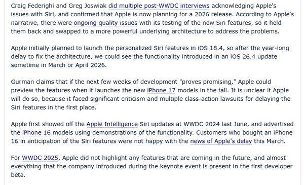 为了提升Siri的性能,苹果已经对传感器算法和本地AI模型进行了升级,并优化了芯片的算力分配。古尔曼透露,如果开发进展顺利,苹果可能会在未来几周内提前展示技术进展,但具体的展示形式尚未确定。值得注意的是,在2025年的WWDC上,苹果并未提及任何未来的功能路线图,所有新特性都已被纳入首个开发者测试版中。